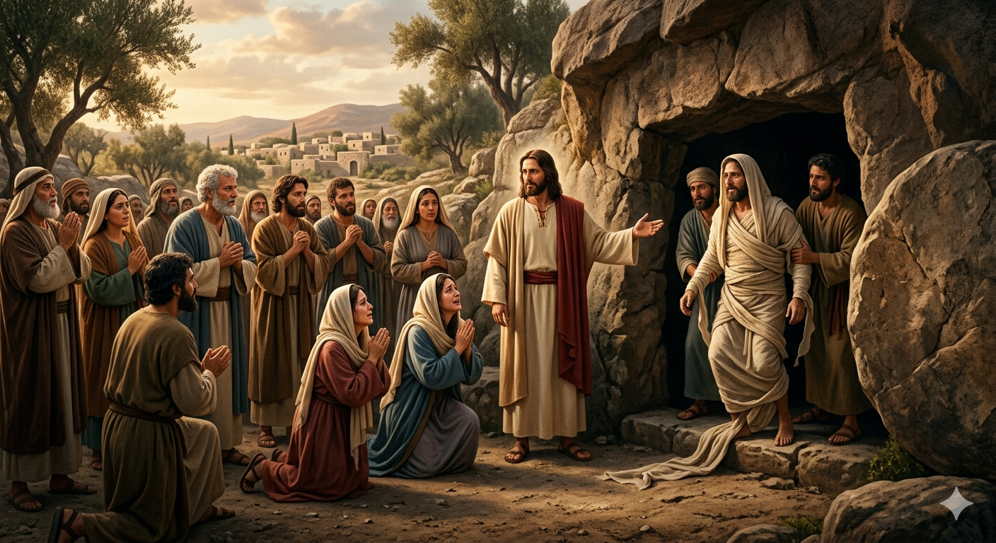 (ខ. ៤០-៤៣): ព្រះយេស៊ូវបញ្ជាឱ្យយកថ្មចេញ ហើយដោយសំឡេងខ្លាំងៗ ទ្រង់ស្រែកថា «ឡាសារអើយ ចូរចេញមក!»។ នេះបង្ហាញពីអំណាចដ៏អស្ចារ្យរបស់ទ្រង់ ដើម្បីហៅព្រលឹងដែលស្លាប់ ឱ្យមានជីវិតឡើងវិញ ដែលបង្ហាញពីការបង្កើតឡើងវិញខាងវិញ្ញាណ និងការរស់ឡើងវិញនាពេលអនាគត។